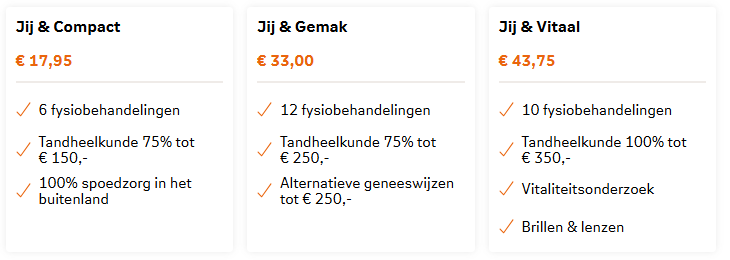 Wilt u niet voor onverwachte kosten komen te staan, of verwacht u specialistische hulp nodig te hebben? Kies dan voor een aanvullende verzekering. Bij het afsluiten van uw premie kunt u kiezen uit zorgbundels die rekening houden met uw leefstijl zoals Jij & Compact of Jij & Gemak. Hiermee sluit u bijvoorbeeld fysiobehandelingen, tandheelkunde of orthodontie bij.